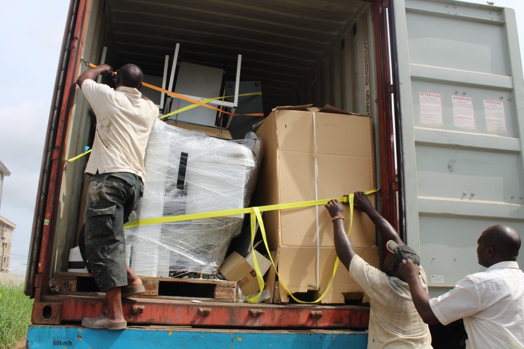 Nach Ankunft der Sachspende in Kamerun erfolgten verschiedene behördliche Abwicklungen einschließlich Verzollung des Materials. Letztendlich konnte am 01.04.2019 die Sachspende aus dem Container entladen werden. Diese wurde zum Teil am gleichen Tag in die Gesundheitseinrichtungen verschickt und ein Teil in einem Lagerraum in Douala aufbewahrt für eine spätere Verteilung in den einzelnen Einrichtungen durch den Verein.