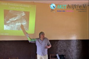 Dieser Kurs war Für den Einsatz in Bandjoun vom 3. bis 6. Juni 2013 ein Schwerpunkt. Nach der ersten Erfahrung während der Auftaktveranstaltung im Juli 2012 wurde ein Curriculum, basierend auf dem Ausbildungsprogramm der DEGUM aufgelegt. Demnach fand dieses Jahr ein Grundkurs in 4 Tage statt.