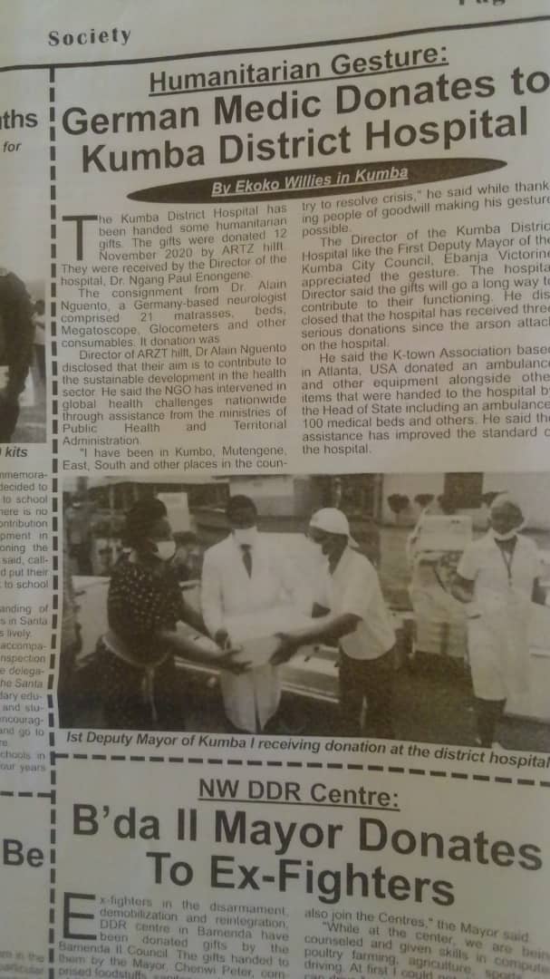 Décembre 2020 Kumba - Le docteur Alain Nguento, President fondateur l'Ong ARZT hilft! e.v basé en Allemagne a offert un don de matériel médical à l’hôpital de district de Kumba.